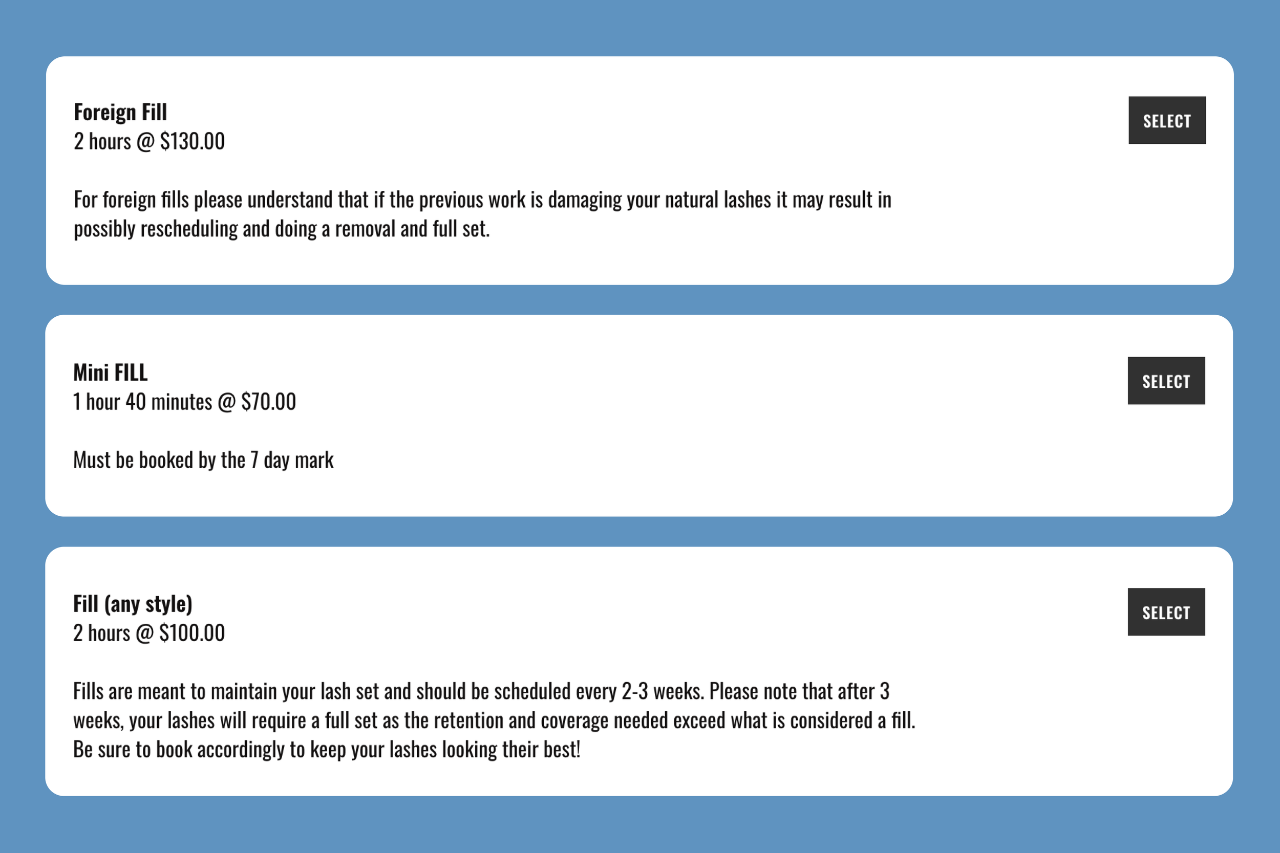 The customizable booking page reflects the brand’s luxe and aesthetic designs. Everything clients need to know is clearly outlined, from business hours to cancellation policies and how to prepare for your service. “I love how customizable Acuity is,” Reynoso says. “The ability to personalize my booking site to reflect The Lash King’s brand has been invaluable.”